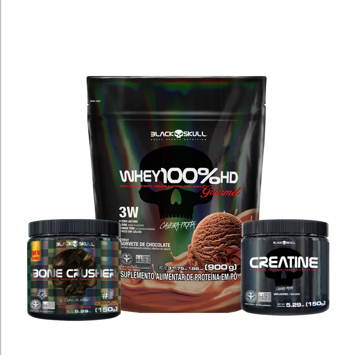 COMBO COMPOSTO POR WHEY 100% HD GOURMET REFIL 900 GRAMAS + CREATINA PURA 150 GRAMAS + BONE CRUSHER PRÉ TREINO 150 G
